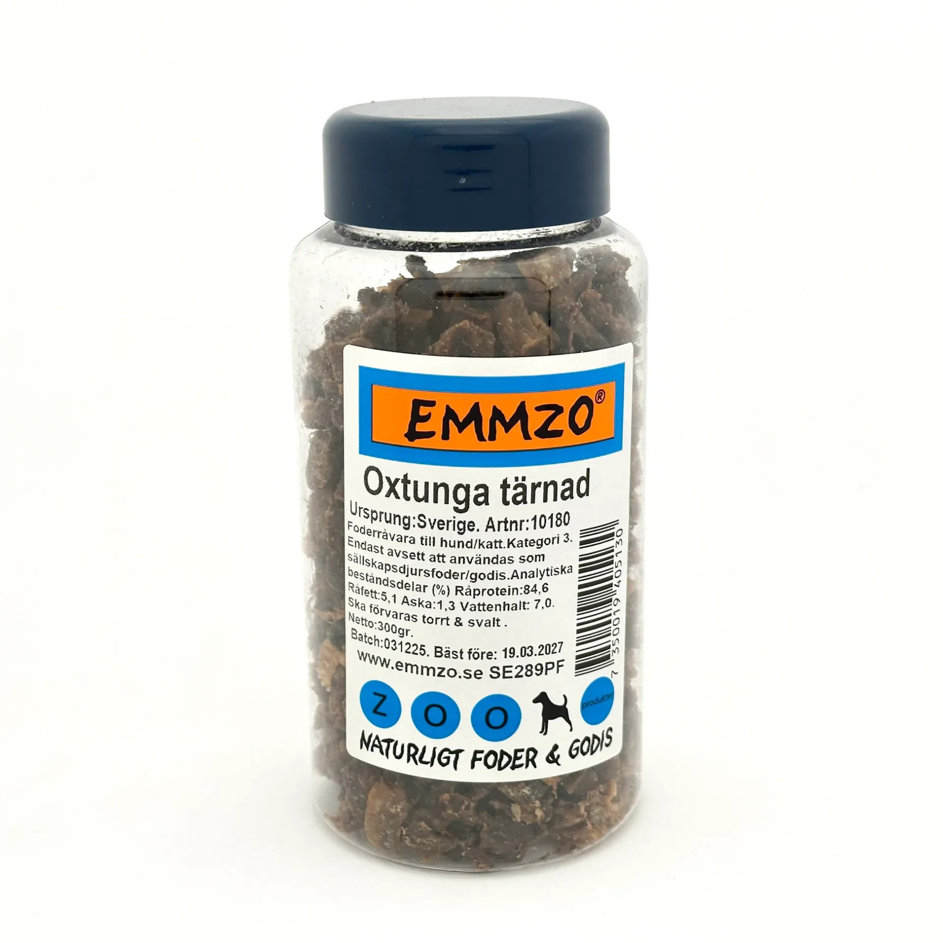 Emmzo Oxtunga är ett svensktillverkat, naturligt hundgodis som består av 100 % torkad svensk oxtunga. Det är populärt som belöningsgodis vid träning tack vare sin smakrikedom och smidiga storlek.