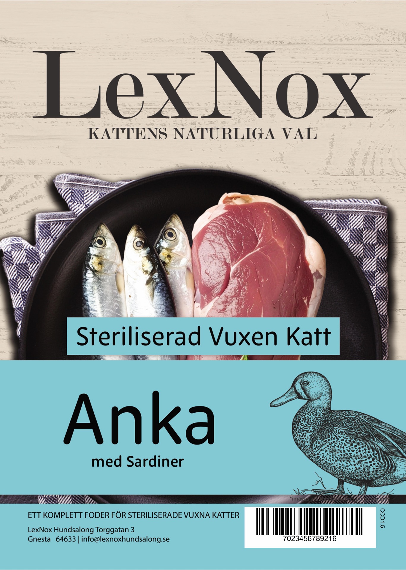 Sammansättning: 70% Anka och Fisk (inklusive 26% färsk förberedd anka, 18% torkad
