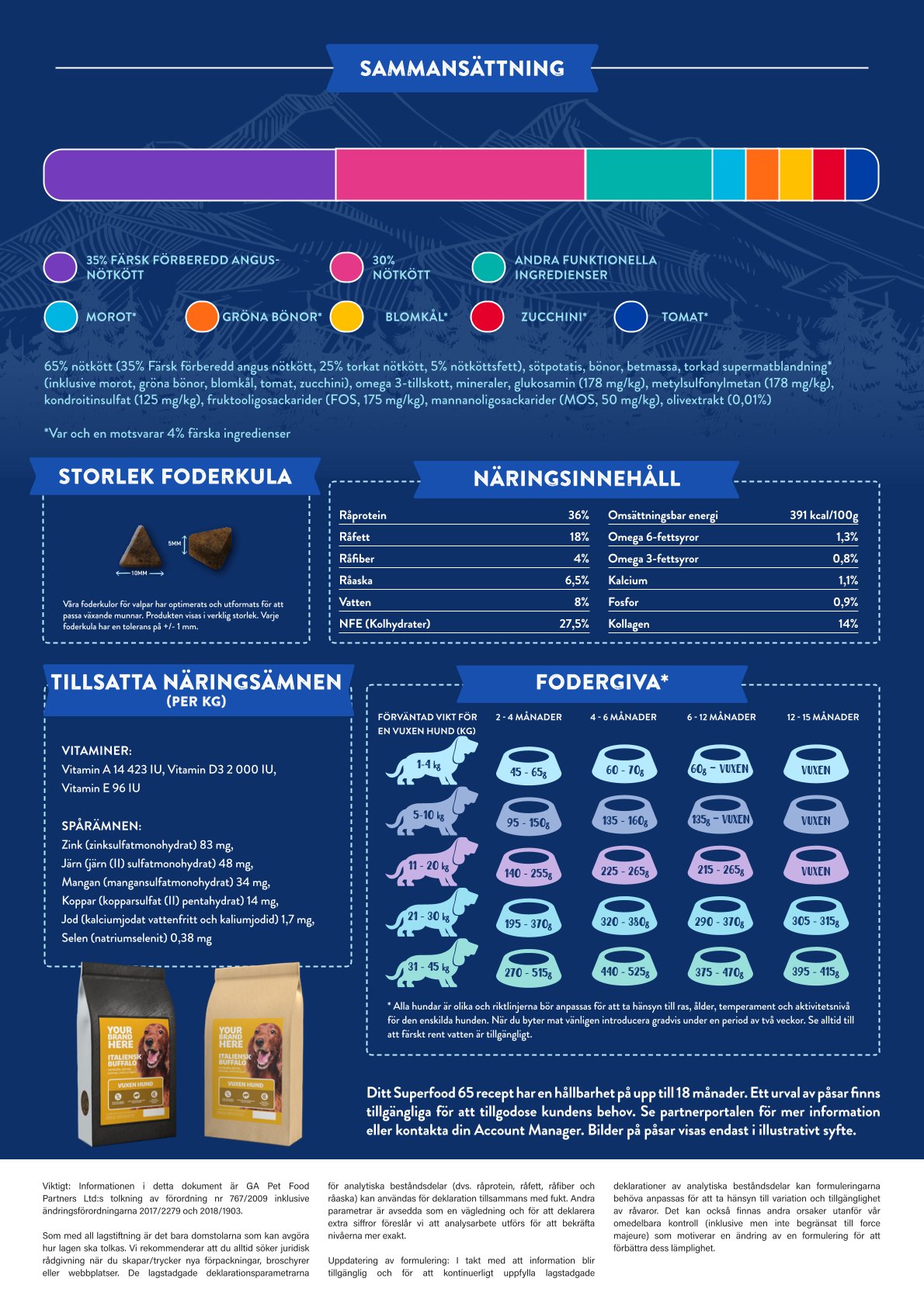 65% nötkött (35% Färsk förberedd angus nötkött, 25% torkat nötkött, 5% nötköttsfett), sötpotatis, bönor, betmassa, torkad supermatblandning* (inklusive morot, gröna bönor, blomkål, tomat, zucchini), omega 3-tillskott, mineraler, glukosamin (178 mg/kg), metylsulfonylmetan (178 mg/kg), kondroitinsulfat (125 mg/kg), fruktooligosackarider (FOS, 175 mg/kg), mannanoligosackarider (MOS, 50 mg/kg), olivextrakt (0,01%)