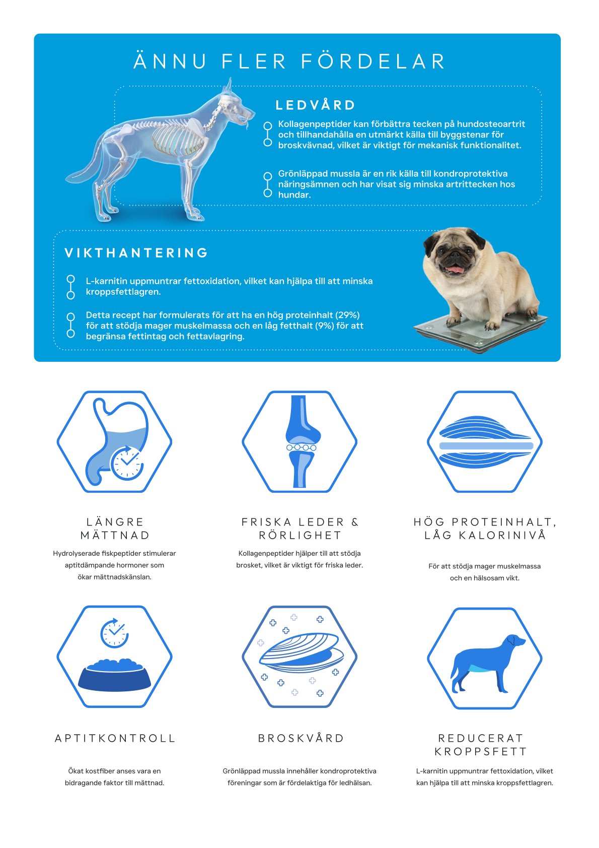LexNox veterinärfoder Viktkontroll och ledvård hjälper till att hålla en hälsosam vikt och främjar ledhälsan vilket är avgörande för långsiktig hälsa och välbefinnande. Övervikt kan ha negativa effekter