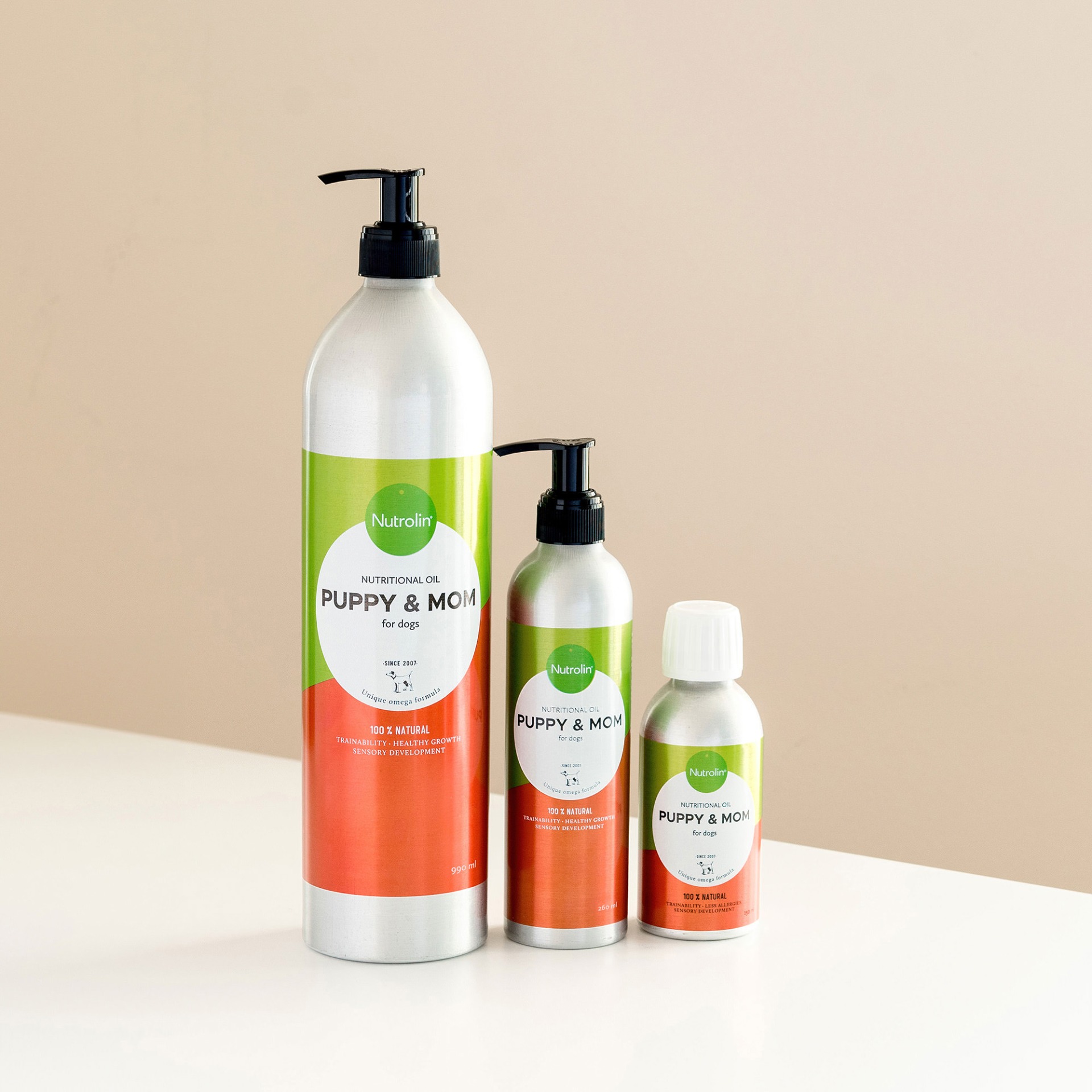 Nutrolin® PUPPY & MOM-näringsoljan är vetenskapligt bevisat det tryggaste omegatillskottet för valpar. Aluminiumflaskan skyddar oljan mot ljus och syre. Detta är viktigt eftersom oxiderade oljor är skadliga för valpens tillväxt och utveckling.
